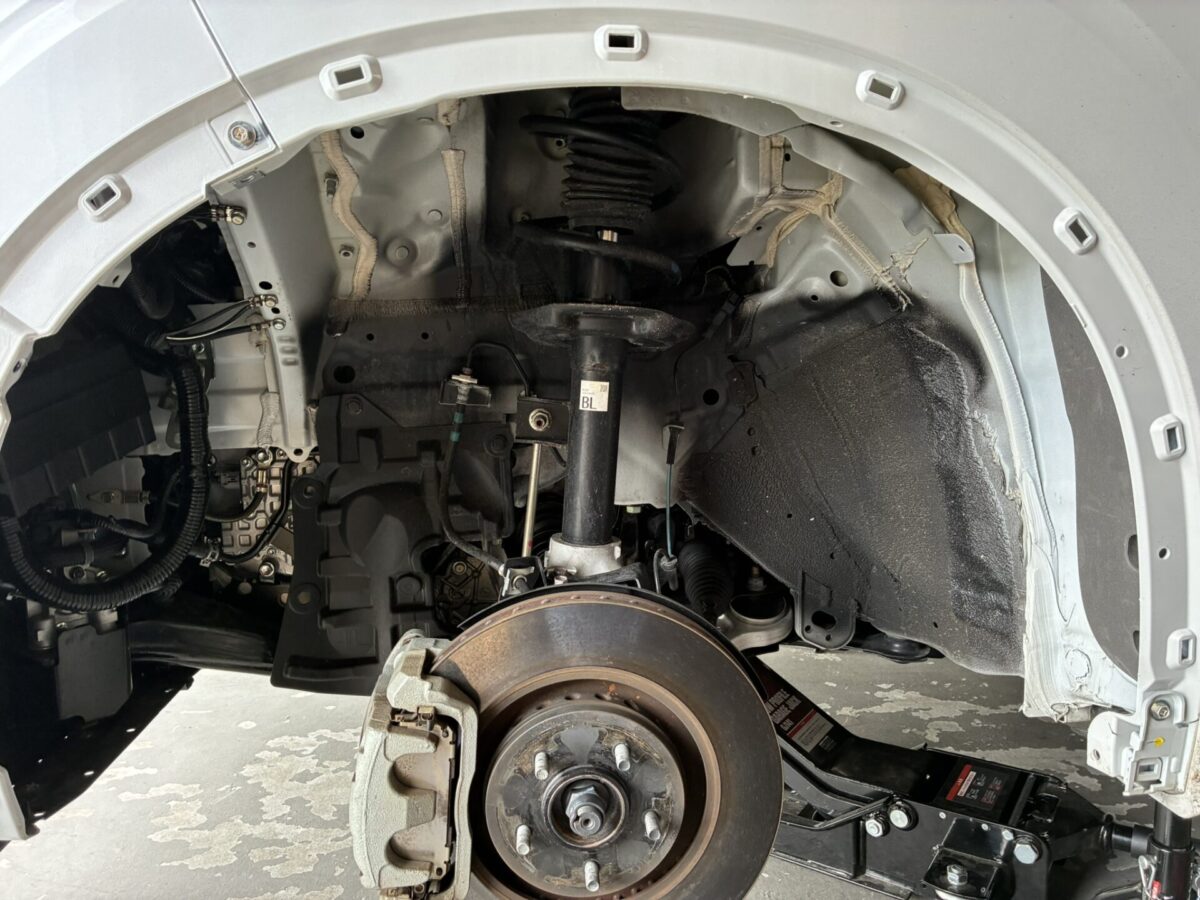 こちらのGN型アウトランダーはフロントショックの外し方にコツがある為、先にフェンダーアーチとインナーカバーを取り外しておきます🔧